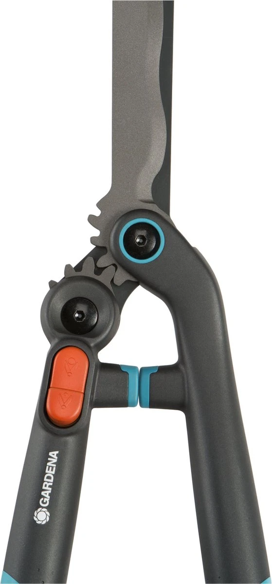 “De EnergyCut van GARDENA overtuigt met zijn ongeëvenaarde 2-in-1-functie en zorgt dat u snel en krachtig werkt met een hoge efficiëntie. Bij het snoeien van heggen of struiken staat een dikkere tak een perfect gelijkmatige snoeibeurt soms in de weg. Activeer dan extra kracht door een druk op de knop. Door de openingshoek te vergroten, neemt de hefboomwerking toe en ontstaat extra kracht.